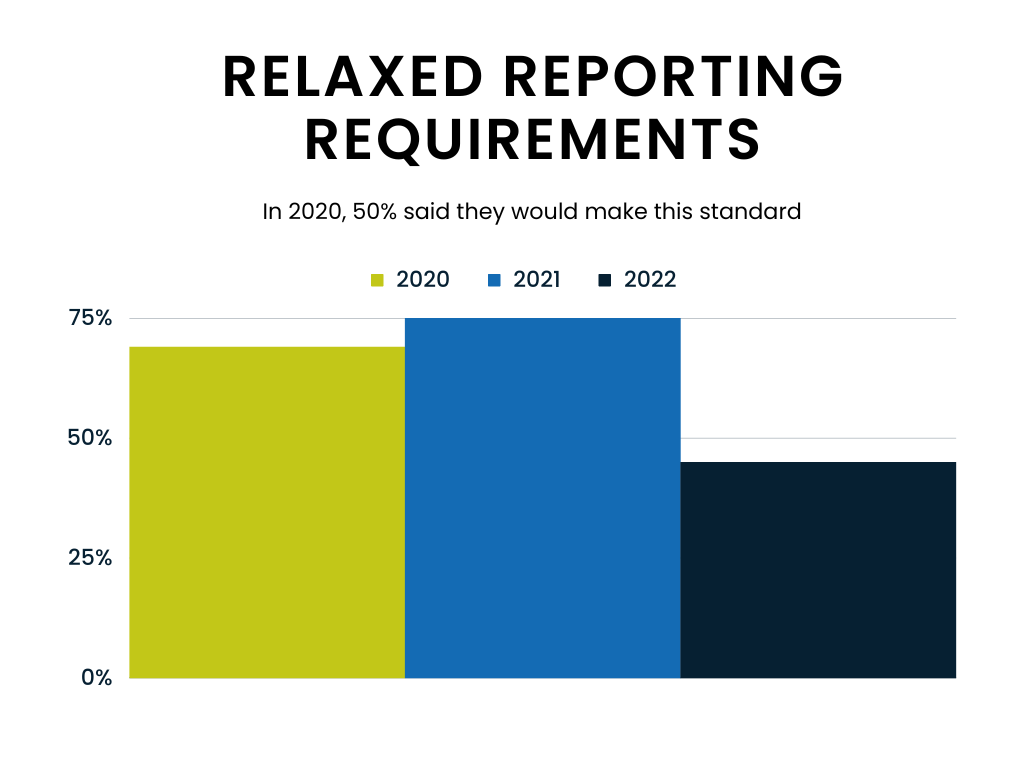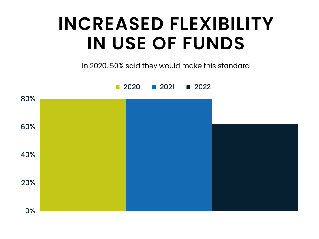 GIA’s members appear to be losing ground on allowing for flexibility in the use of their funds, with 60% saying they’d increased flexibility in 2022. While this is more than had projected doing so (50%), it is far fewer than did so in 2020 (80%) and in 2021 (89%). Similarly, GIA’s members appear to be losing ground on relaxing their reporting requirements, with 45% saying they’d relaxed their reporting requirements in 2022. Again, while this is more than had projected doing so (32%), it is far fewer than did so in 2020 (69%) and in 2021 (75%).